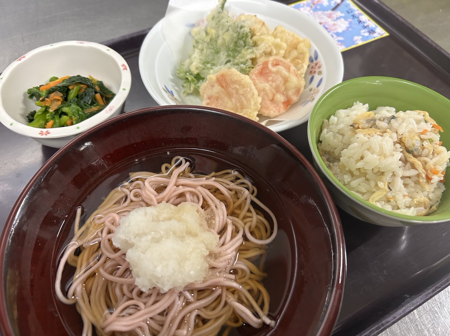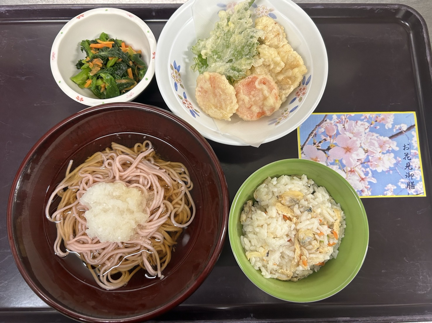 「アサリの炊き込みご飯・桜おろしそば・姫鯛の天ぷら・菜の花のお浸し」