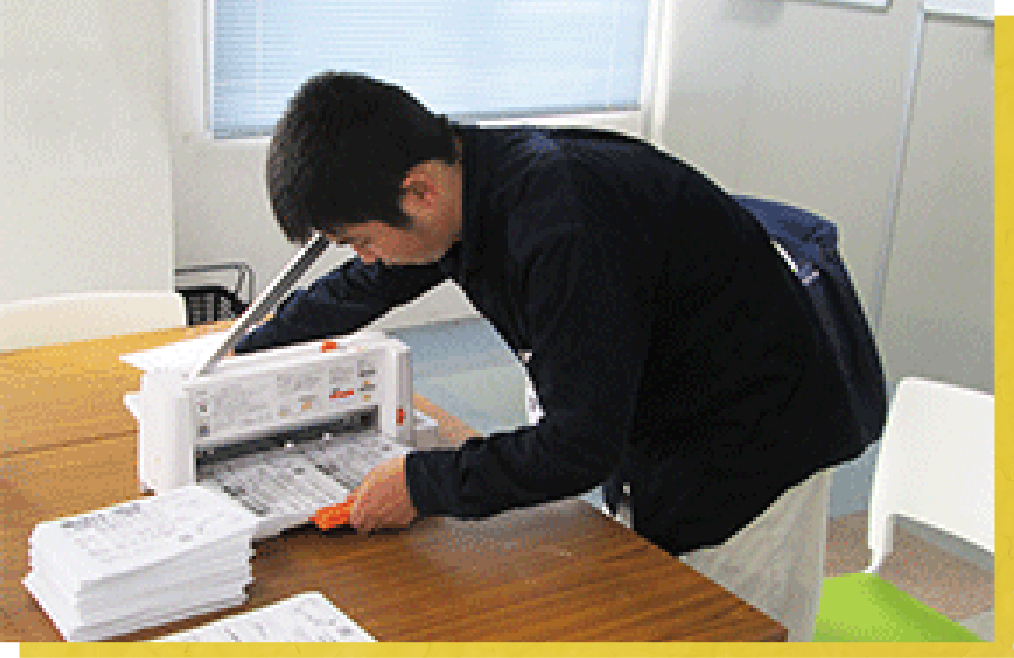 求人のチラシは100枚以上、時には数千枚に及びます。1枚の印刷物を4枚のチラシにカットします。